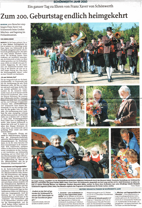 | 1. Festliches Bläserstück (Blaskapelle Beratzhausen) 2. Begrüßung durch einen Vertreter des Bezirks 3. Laudatio durch Herrn Chr. Henzel, Regionalleiter E.ON Bayern 4. Ode an Franz Xaver von Schönwerth von M. Müller-Henning 5. Überreichung der Ehrengaben 6. Alte bayerische Königshymne (Blaskapelle Beratzhausen) 7. Dankesworte von Schönwerth 8. Entsendung der Märchen- und Sagenfiguren in das Gelände 9. Bayerischer Defiliermarsch (Blaskapelle Beratzhausen) Abfahrt der Kutsche zum Wirtshaus 10. Auflösung des Festzuges |